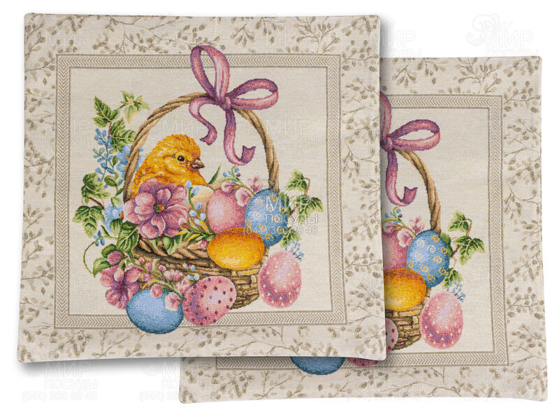 Гобеленовая наволочка от Lefard с нежным пасхальным дизайном, украшенная корзинкой с писанками, весенними цветами и милым цыпленком. Светлый фон и яркие акценты создают праздничную атмосферу и уют. Плотная ткань хорошо держит форму, устойчива к износу и проста в уходе.