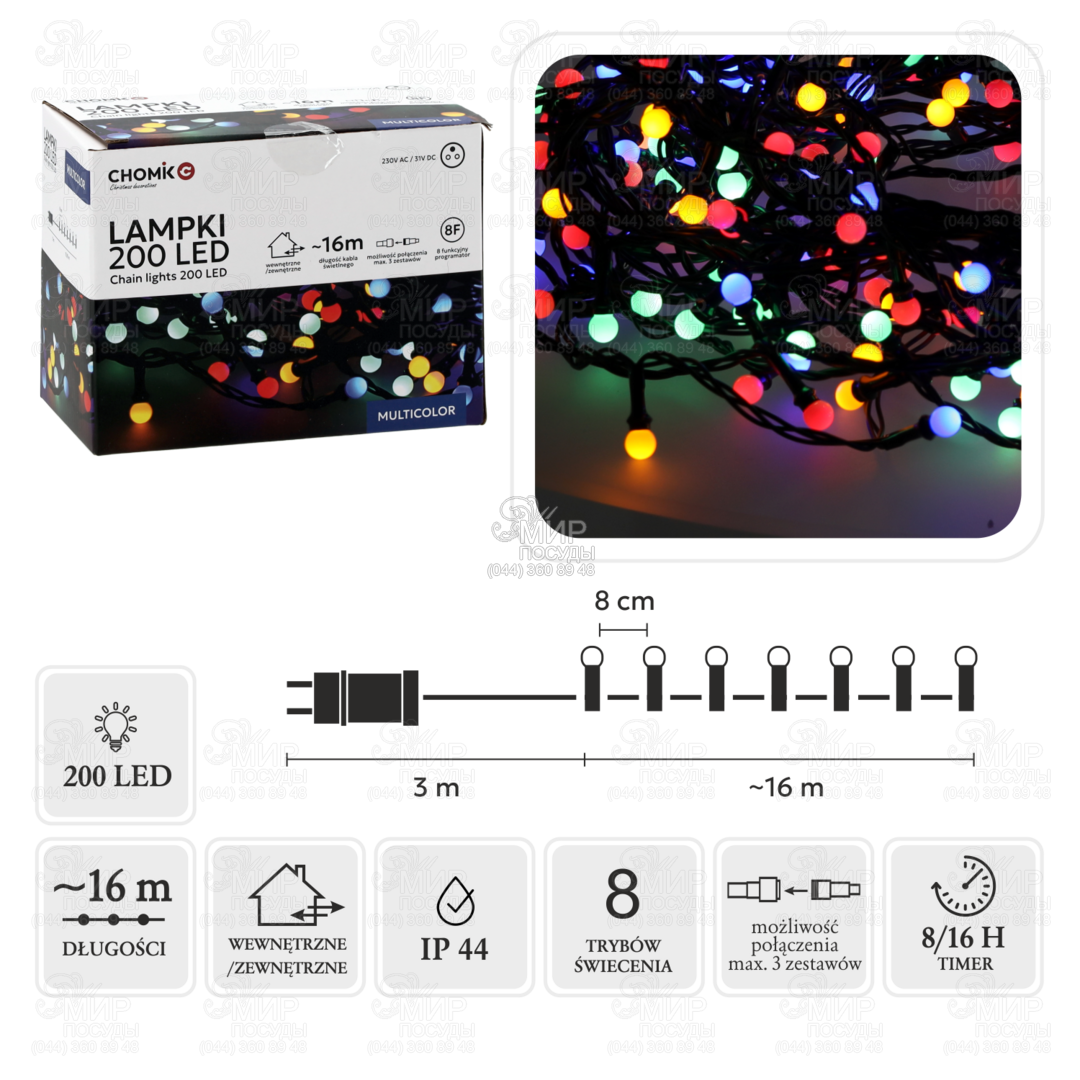 Гирлянда с 200 диодами multicolor. Благодаря расположению диодов через каждых 8 сантиметров они создают невероятно эффектное и уютное свечение, идеально подходящее для рождественского декора интерьера.