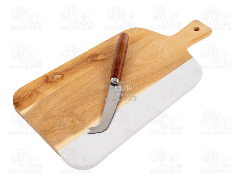 Натуральная, крепкая и стильная доска станет настоящим украшением Вашей кухни. Изготовленная из качественного дерева и мрамора, она сочетает в себе практичность и естественную эстетику. Благодаря гладкой поверхности и удобной ручке доска идеально подходит для подачи сыров, а для его нарезки в комплекте идет нож.