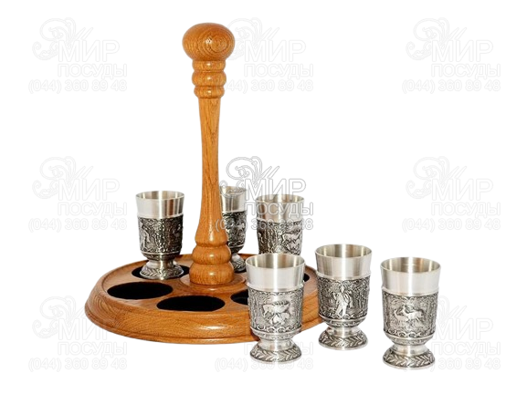 Набор рюмок от немецкого производителя Artina SKS изготовлен из пищевого олова. Во всем мире продукция данной компании славится прекрасной ручной работой мастеров - для достижения совершенно гладкой поверхности бокалов, кружек, графинов их полируют вручную. Стенки изделий украшены барельефами картин.
