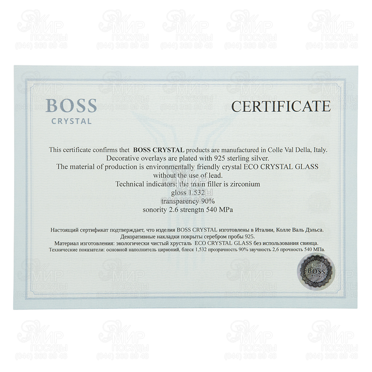 Изделия бренда Boss Crystal с легкостью превратят встречу с друзьями в непревзойденную атмосферу праздника и уюта. Они отличаются безупречным качеством, роскошью исполнения и одновременно классической простотой стиля. В производстве хрусталя используется современная технология без использования оксида свинца, который заменен на цирконий для прочности и звона, а также барий для оптической игры света на гранях изделий. Плавление кварцита происходит в экологически чистых электрических печах.