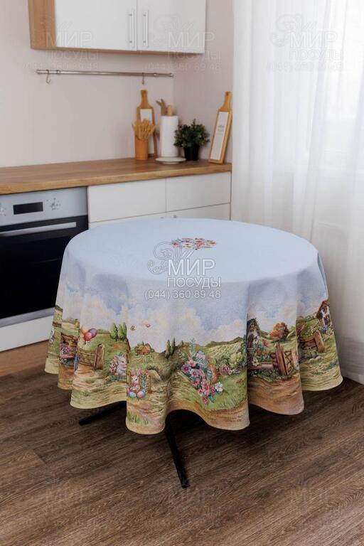Пасхальная коллекция гобелена Настроение от украинского бренда Прованс — это настоящая весенняя история, сотканная в ткани. Дизайн наполнен атмосферой уютного деревенского пейзажа: зеленые лужайки, декоративные ограждения, цветущие сады, праздничные корзины с писанками и милый пасхальный кролик создают ощущение теплой семейной традиции и светлого праздника. Панорамный сюжет расположен вдоль края изделий, что придает скатерти особую выразительность и делает ее центральным акцентом сервировки. Нежное голубое основание гармонично сочетается с пастельными оттенками зеленого, розового и кремового, создавая легкое, свежее весеннее настроение. Гобеленовое переплетение обеспечивает объемность рисунка и глубину цвета – изображение не нанесено поверхностно, а выткано в структуре ткани. Благодаря этому изделия отличаются плотностью, долговечностью и стойкостью к износу. Коллекция идеально подходит для праздничного стола на Пасху и создания сезонного декора в доме. В серии представлены скатерти, декоративные наволочки и текстильные аксессуары, легко комбинирующиеся между собой, формируя завершенную композицию.