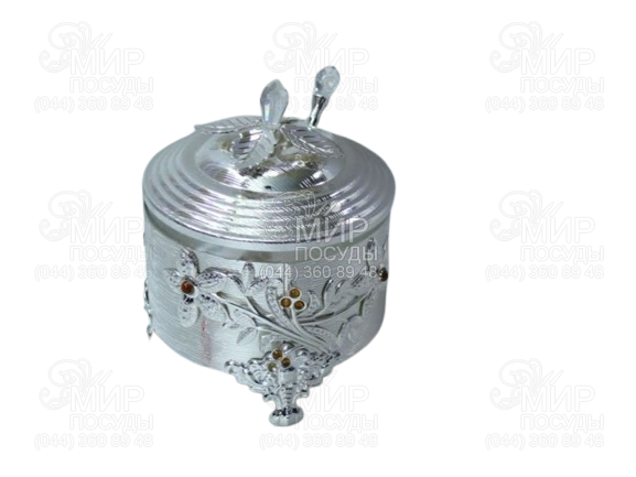 Изделие выполнено в благородном серебристом цвете с декоративным растительным орнаментом и аккуратными вставками, которые придают сахарнице особый шарм. Крышка с удобной ручкой помогает хранить свежий сахар и защищает его от влаги. Благодаря декоративным ножкам и изысканному оформлению сахарница станет не только функциональным предметом, но и стильным акцентом для чаепития или кофейной паузы.