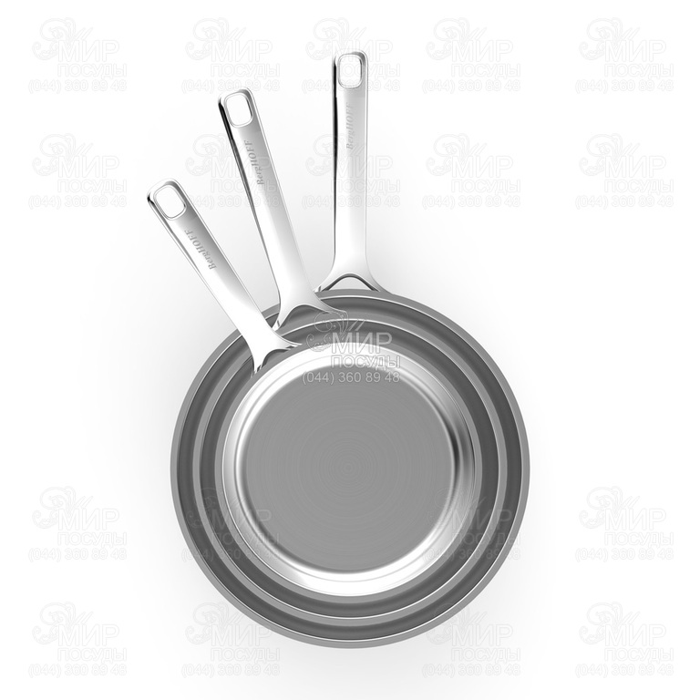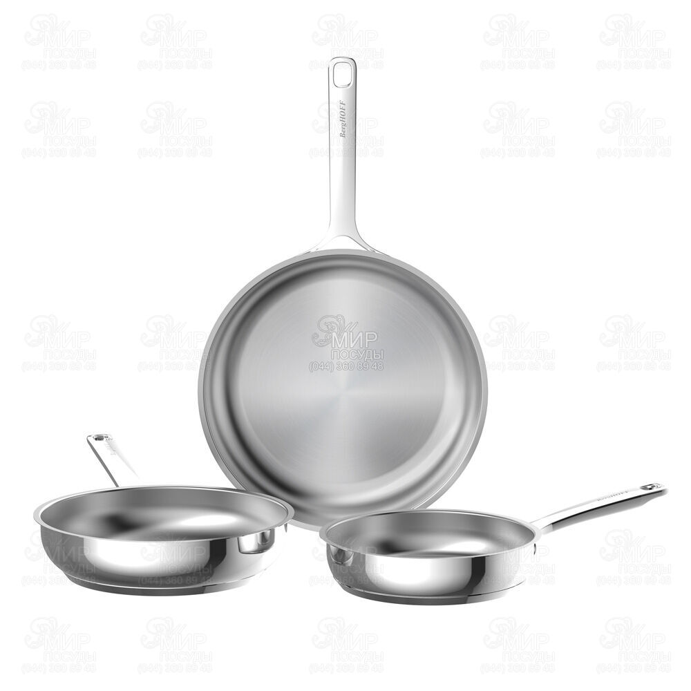 Набор сковородок Helix от бельгийского производителя BergHOFF изготовлен из переработанной нержавеющей стали. Данные емкости справятся с работой на любой плите, включая индукционную.