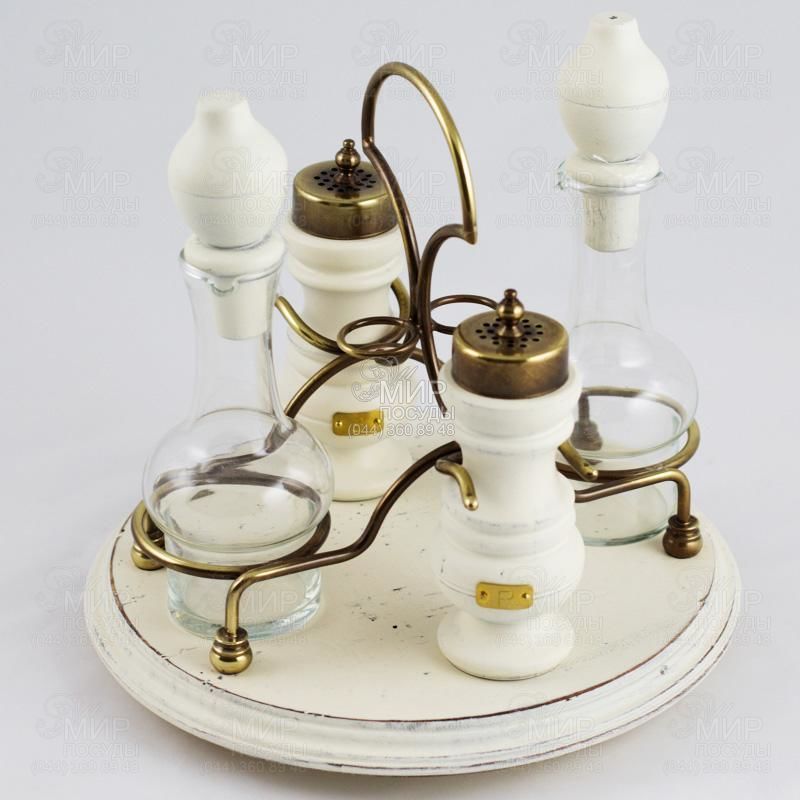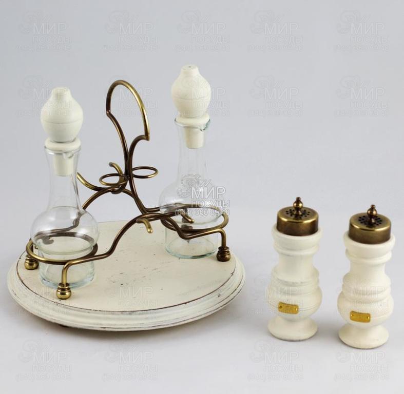 Характеристика: подставки - диаметр 24,5 см, высота 24 см, банки для специй - диаметр 5,5 см, высота 15 см, бутылка для масла/уксуса - диаметр 7 см, высота 20 см