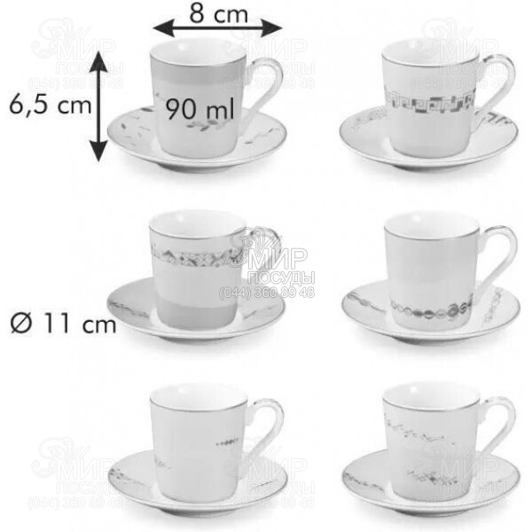 Характеристика: об'єм 90 мл, висота 6,5 см, діаметр 8 см, діаметр блюдця 11 см