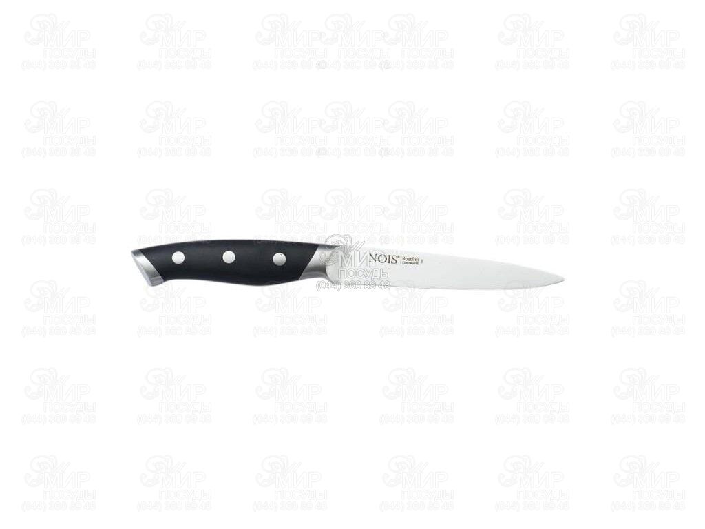 Ніж від польського виробника Nois виготовлений із катаної нержавіючої сталі X50CrMoV15 твердістю 55+/-1 HRC. Конструкція та форма ножа забезпечують зручність використання. Гостре, тонке лезо легко ріже продукти різної твердості. Гладка, ретельно відполірована поверхня леза забезпечує точне нарізування, не деформуючи продукт. Місце з'єднання леза з рукояткою запобігає скупченню бактерій та бруду. Виступ між лезом та рукояткою забезпечує надійну опору для вказівного пальця та покращує баланс, дозволяючи працювати довго без втоми.