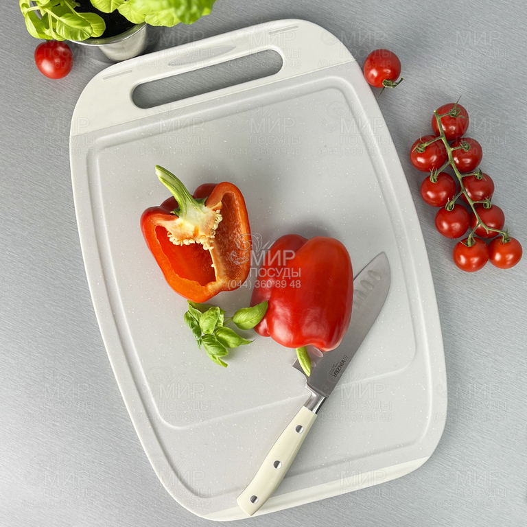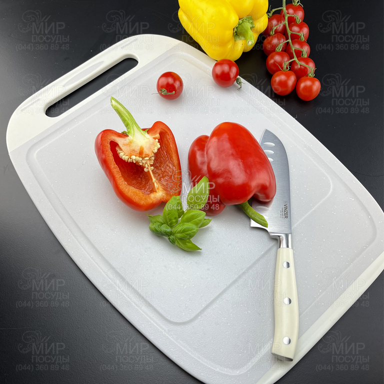 Обробна дошка Vinzer – незамінний предмет на кожній кухні, який використовується щодня для нарізки, шинкування та подрібнення продуктів. Дошка виготовлена з харчового пластику високої якості без вмісту небезпечних компонентів. Матеріал легко миється, не вбирає вологу і запахи. Нековзна поверхня забезпечує зручне та безпечне використання, а також зберігає лезо ножа гострим. Дошка оснащена прогумованою вставкою по краях для надійної фіксації на столі та має канавку для стікання рідини.
