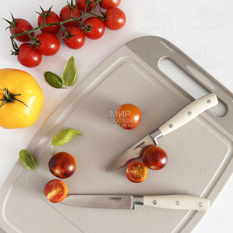 Обробна дошка Vinzer – незамінний предмет на кожній кухні, який використовується щодня для нарізки, шинкування та подрібнення продуктів. Дошка виготовлена з харчового пластику високої якості без вмісту небезпечних компонентів. Матеріал легко миється, не вбирає вологу і запахи. Нековзна поверхня забезпечує зручне та безпечне використання, а також зберігає лезо ножа гострим. Дошка оснащена прогумованою вставкою по краях для надійної фіксації на столі та має канавку для стікання рідини.