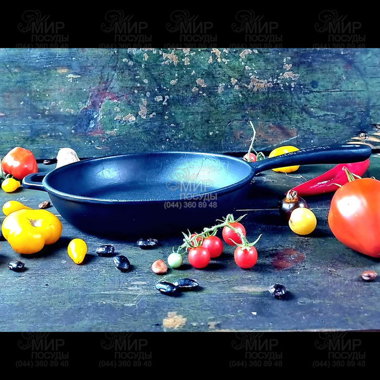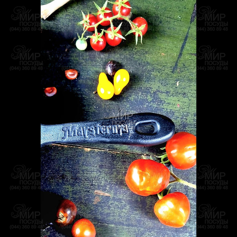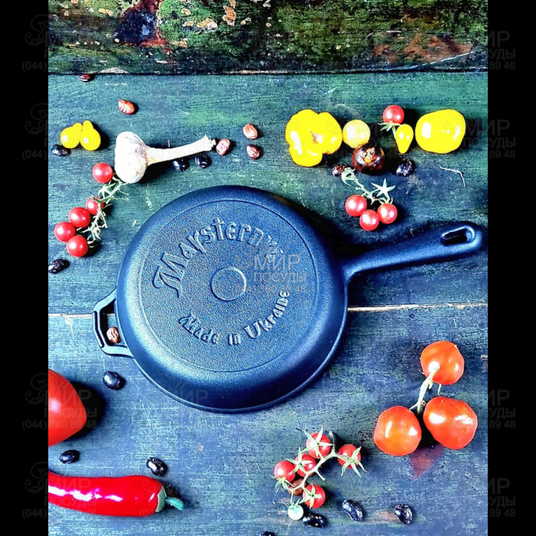 Пательня від українського бренду Maysternya виготовлена з чавуну. Покриття на чавунному посуді утворюється в процесі прожарювання, а в процесі приготування воно постійно оновлюється. Але це не антипригарне покриття, а найтонша полімерна плівка із запеченого масла, яка захищає пательню від корозії, а також має гідрофобні властивості (відштовхує воду). І тому, щоб не прилипало, готувати потрібно з олією. Чавун має гарну теплопровідність, що дозволяє рівномірно прогрівати всю поверхню пательні і рівномірно смажити.