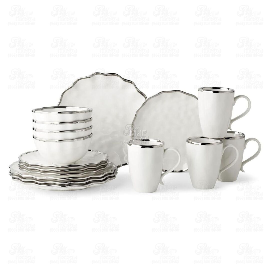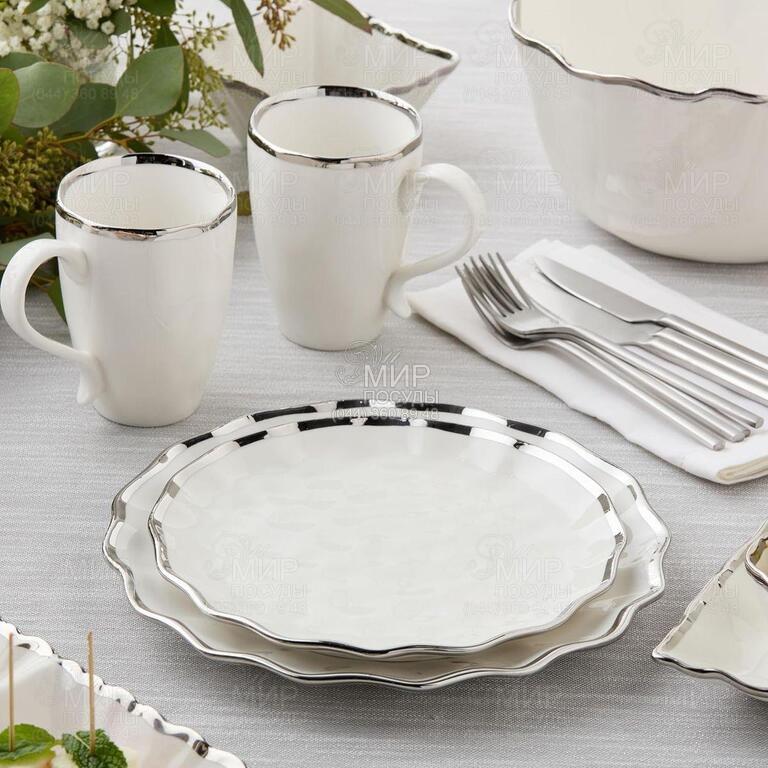 Столовий сервіз із колекції Regency Silver від американського бренду Certified International виготовлений із надміцної кераміки та покритий зносостійкою глазур'ю. Вироби прикрашені розписаним вручну платиновим ободом, який додає нотки розкоші до будь-якої страви. Злегка зазубрені краї посуду створюють вишуканий вигляд, який чудово поєднується з іншими предметами серії Regency.