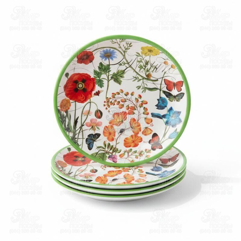 Набір тарілок Оранжерея від американського бренду Certified International виготовлений із меламіну. Кожна ємність прикрашена унікальним та яскравим квітковим візерунком, доповненим витонченими метеликами та бабками. Тарілки ідеально підходять як для повсякденного використання, так і для особливих випадків.