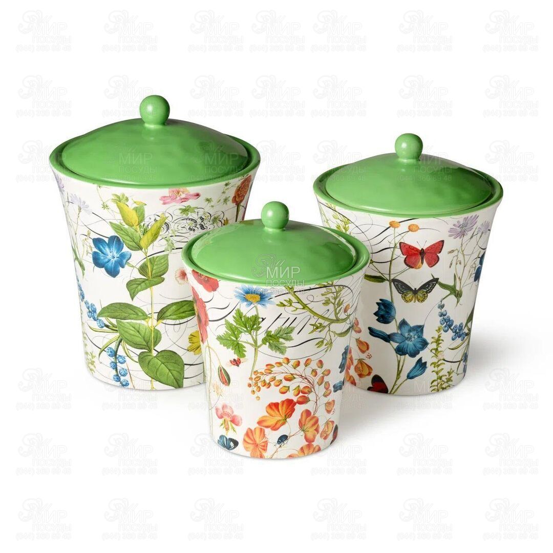 Набір ємностей Оранжерея від американського бренду Certified International виготовлений із надміцної кераміки та покритий зносостійкою глазур'ю. Ємності прикрашені унікальним і яскравим квітковим візерунком, доповненим витонченими метеликами та бабками.