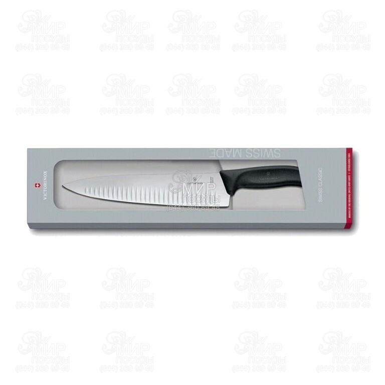 Ніж Chef's Swiss Classic від Victorinox виготовлений із високоякісної нержавіючої сталі. Значно полегшує роботу з твердими овочами і фруктами, такими як огірки, кабачки, гарбуз, кавун та інші. Його конструкція продумана до дрібниць: широке лезо з повітряними кишенями вздовж різальної крайки, гострий кінчик і гладка заточка забезпечують точність і легкість нарізки. Завдяки цим особливостям ніж ідеально підходить для шинкування, обробки та підготовки продуктів до подальшого приготування. Без проблем витримує частий контакт із вологою, зберігаючи гостроту навіть за інтенсивного використання. Ергономічне руків'я розроблено з урахуванням зручності та безпеки, воно знижує навантаження на кисть під час тривалої роботи, а його шорстка поверхня перешкоджає ковзанню, забезпечуючи надійний хват. Руків'я стійке до високих температур, не перегрівається і не деформується згодом, а також витримує механічні навантаження, включаючи удари і тиск.