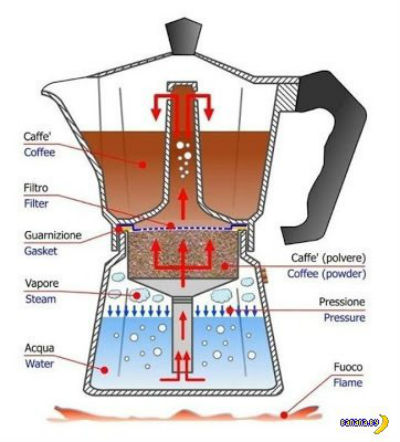 Кофеварка сразу завоевала невероятную популярность в Италии благодаря своей универсальности. Она подходила как для электрических, так и для газовых плит. Технология была удивительно проста. Нагреваясь, вода попадала из нижнего резервуара наверх, проходя через фильтр с молотым кофе, и выливалась в верхний резервуар вкуснейшим горячим напитком.