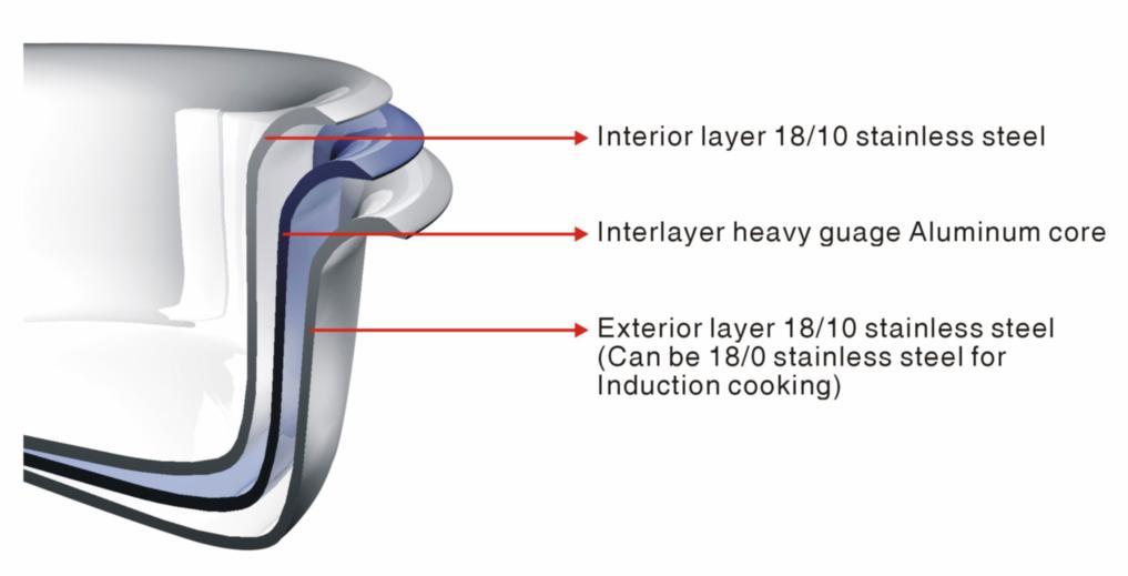 Снаружи и внутри посуды – слои нержавеющей стали 18/10 каждый толщиной от 0,4 мм до 0,5 мм, между ними – слой из алюминия толщиной от 1,4 мм до 1,5 мм. Снаружи – полированная сталь, внутри – матовая. Здесь пища соприкасается только с гигиеничной нержавеющей сталью. Промежуточный слой алюминия благодаря своей теплопроводности способствует быстрому и равномерному распределению тепла по стенкам посуды - от дна до ее верхнего края.