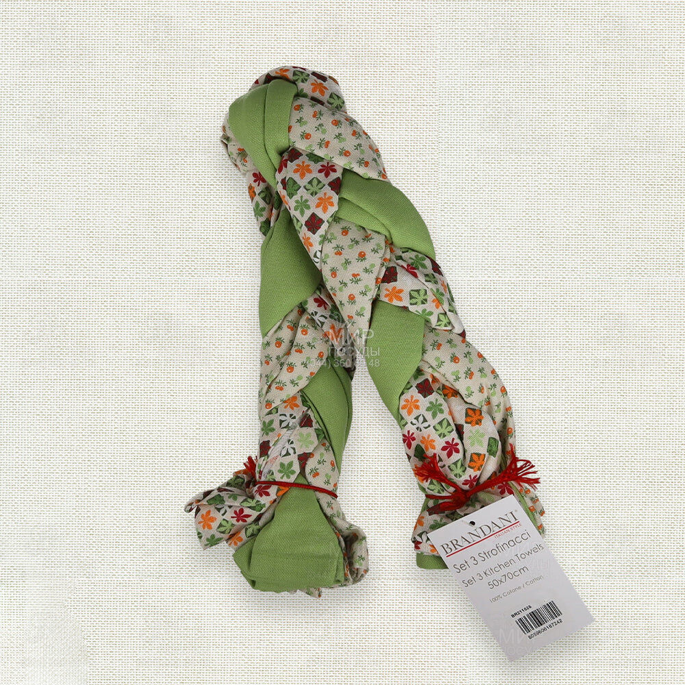 Набор полотенец из коллекции Le Primizie от итальянского производителя Brandani изготовлен из 100% хлопка. Одно полотенце сплошного зеленого цвета, а второе и третье с оранжево-зеленым цветочным узором.