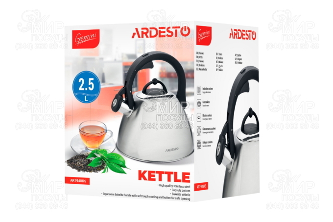 Чайник серии Gemini от украинского бренда Ardesto изготовлен из нержавеющей стали. Наружная часть чайника обладает глянцевой полировкой, а носик оборудован свистком. Нейлоновая ручка с покрытием Soft-touch обеспечивает удобство и комфорт при использовании.