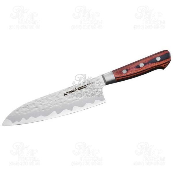 Традиционный японский нож Сантоку отлично подходит для нарезки, рубки и измельчения продуктов. Невероятно острый, отлично сбалансированный нож станет незаменимым помощником на домашней кухне. Японская нержавеющая cталь AUS-8, из которой изготовлен нож, обладает хорошей коррозионной устойчивостью, отличной стойкостью режущей кромки, легко полируется и шлифуется. Необычная финишная отделка лезвия создает во время реза воздушную подушку, благодаря чему исключается налипание ломтиков продуктов при нарезке. Рукоять ножа, выполненная из дерева, удобно лежит в руке, не скользит и устойчива к агрессивным средам. Samura "KAIJU" - это коллекционные ножи современного дизайна, которые станут истинным украшением на любой кухне .
