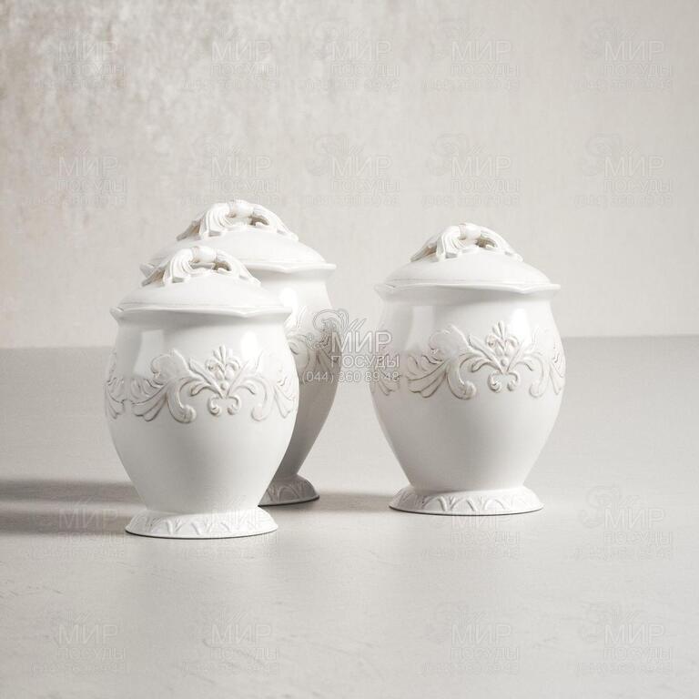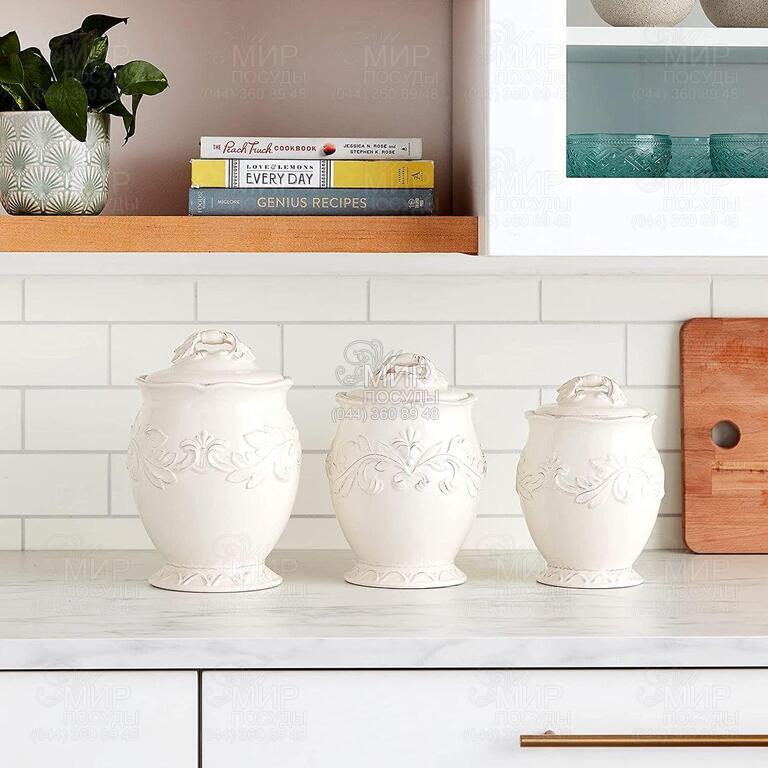 Керамические емкости, представленные в трех размерах, станут роскошным украшением кухни или столовой, оформленной в классическом французском стиле или с элементами бохо, шеби-шик и прованс. Дизайн изящных изделий, похожих на античные произведения искусства, разработала американская художница Памела Гладдинг. Емкости оттенка слоновой кости и их ручки украшают рельефные тиснения в виде листьев многолетнего растения аканта. Емкости из прочной керамики оснащены герметичными крышками, защищающими сыпучие продукты от сырости и насекомых.