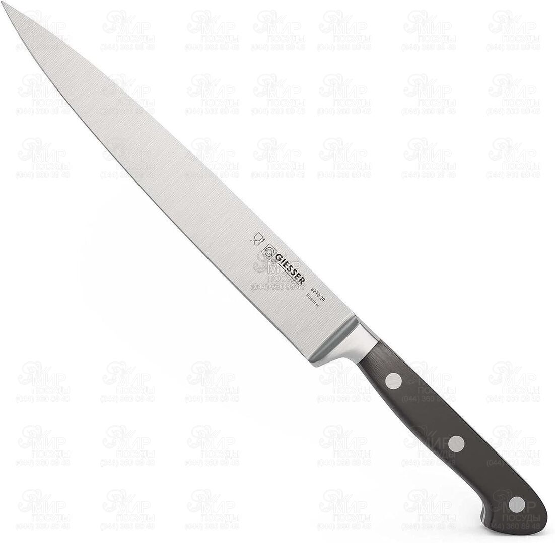 Нож от немецкого производителя Giesser изготовлен из высококачественной хромомолибденовой стали. Пластиковая ручка с тройными заклепками обеспечивает надежную фиксацию при выполнении любых профессиональных кухонных работ.