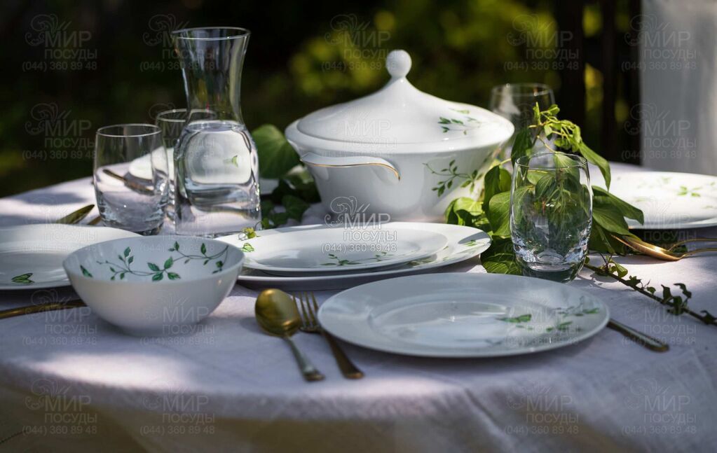 Margaret Magic Garden – это классический белый фарфор, украшенный тонкими орнаментами зеленых оттенков с добавлением золота. Он создает украшения