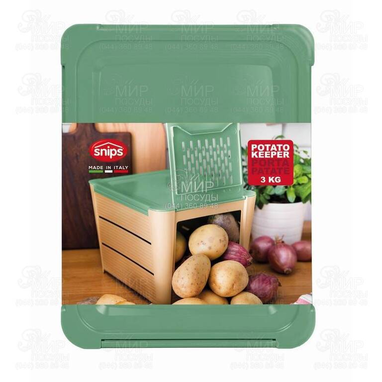 Контейнер для хранения овощей Snips в стильном бежево-зеленом дизайне способен вместить до 3 кг картофеля, лука, моркови или других овощей и сохранить их свежесть в течение длительного времени благодаря качественной и практичной конструкции. Контейнер темный и хорошо вентилируемый – специальные отверстия в боковых частях изделия обеспечивают необходимую циркуляцию воздуха, что создает питательную среду для длительного хранения овощей. Верхняя крышка снимается и обеспечивает удобство наполнения. Доставать овощи так же удобно благодаря переднему лючку. Конструкция изделия подразумевает штабелирование.