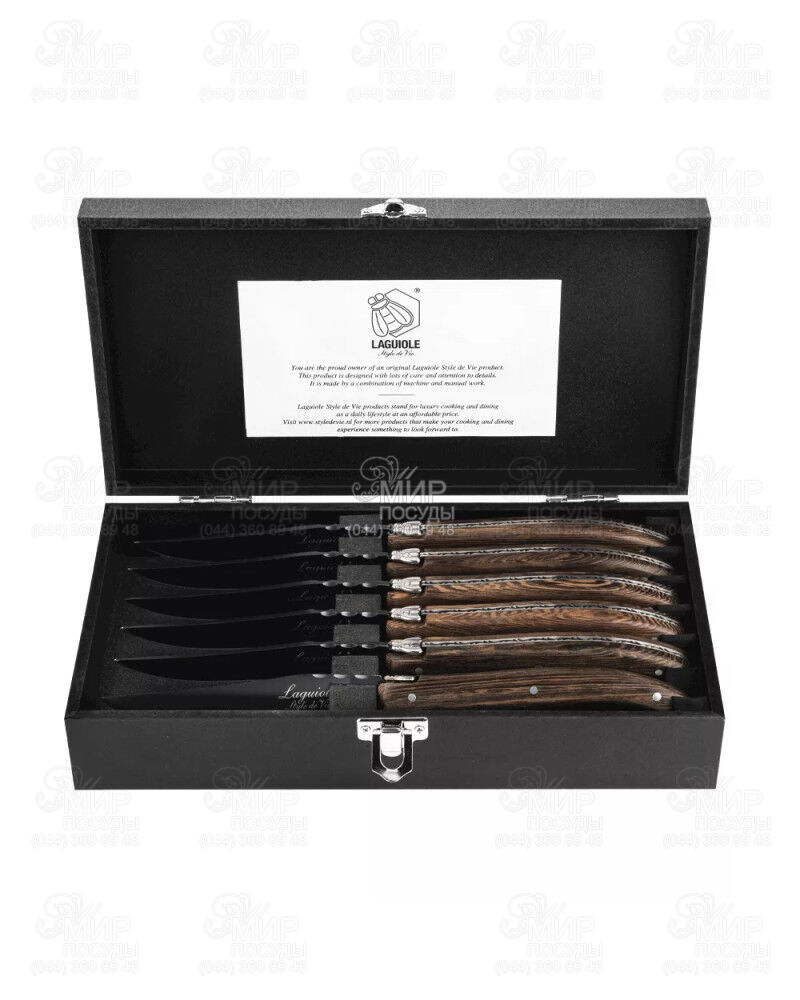 Ножи для стейков Luxury Line от Laguiole Style de Vie помогут разделать мясо быстро и стильно. Лезвие ножей изготовлено из нержавеющей стали и имеет черное покрытие, а рукоятки изготовлены из дерева венге. Темное дерево в сочетании с черным лезвием придает ножам шикарный вид. Удивите своих друзей и знакомых за ужином этими прекрасными столовыми приборами. Нельзя мыть в посудомоечной машине.