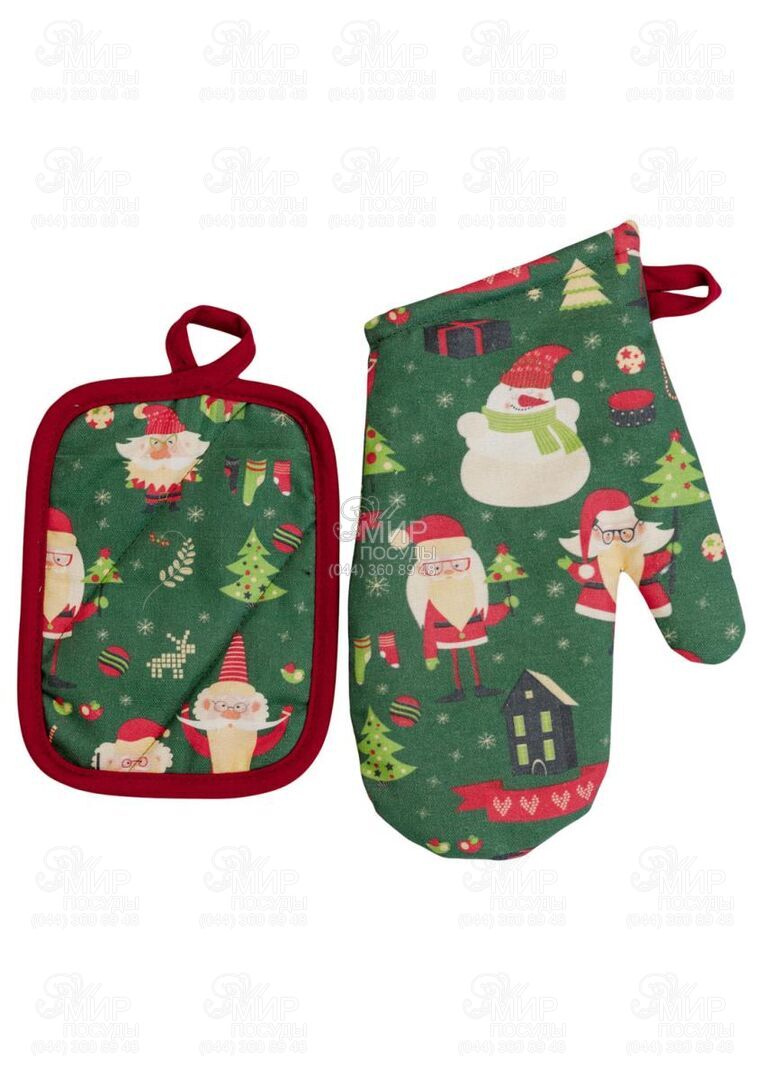 Мир посуды - Кухонные аксессуары - Рукавицы, прихватки, фартуки - Набор прихваток Санта на зеленом 4823093463226