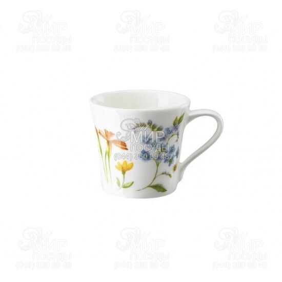 Чашка для кофе из коллекции Nora Spring Vibes от немецкого производителя Hutschenreuther изготовлена из костяного фарфора. Нежные колокольчики, незабудки, пурпурный клевер и желтые лютики изображены с большой любовью к деталям и выглядят на тонком сияющем Bone China как нарисованные. На каждой части посуды цветы умело располагаются индивидуально. На тарелках изящные растительные мотивы прижимаются к краю, на чашках они кажутся растущими вверх. В контрасте с этим на блюдцах украшает только одна маленькая бабочка.