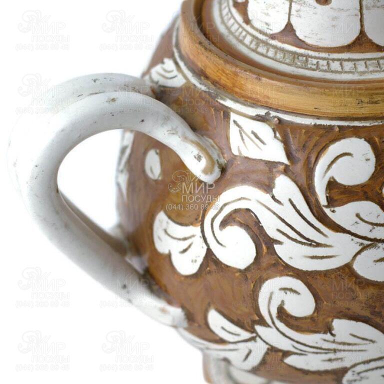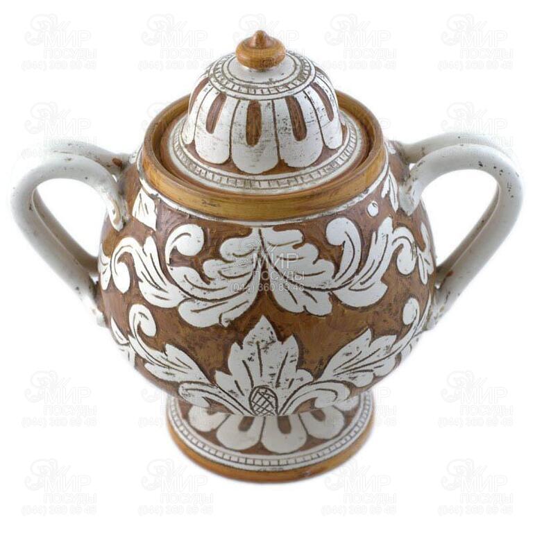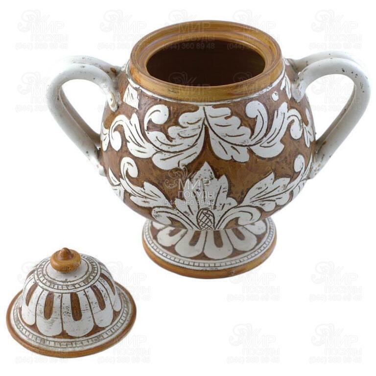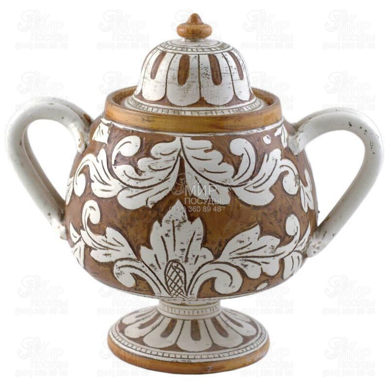Керамический горшок ручной работы с крышкой и двумя ручками. Это неординарное изделие, как и вся коллекция Scalfito от L´Antica Deruta, отличается изысканной стилизацией под старину и удивительной резьбой, формирующей оригинальную фактуру поверхности. Керамический горшок имеет форму древнеримской амфоры, дополненной изящной крышкой. Коричнево-белая гамма подчеркивает все тонкости рельефного узора, выполненного с тщательной детализацией каждого фрагмента. В рисунке сочетаются классические строгие элементы античного орнамента и мягкое сплетение кружевных листьев. Ручная роспись с применением техники искусственного старения, придает декоративному изделию благородный вид древнего произведения гончарного искусства.