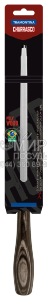 Мусат серии Polywood от бразильской компании по производству посуды Tramontina надежен и практичен. Рабочая часть мусата изготовлена из углеродистой стали. Ручка выполнена из натурального дерева, тщательно шлифованного и дополнительно обработанного, делая его водостойким. Можно мыть в посудомоечной машине. Для того чтобы подточить нож, достаточно несколько раз с небольшим усилием провести затупившимся лезвием под углом по мусату. Оптимальным считается угол 20 градусов.