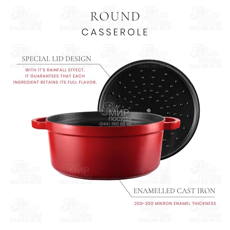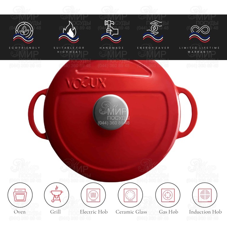 Кастрюля от французского бренда Voeux на 100 % изготовленная из чугуна. Внутренняя часть покрыта прочной эмалью с высокой устойчивостью к кислотам и коррозии. На 80% изготовленная вручную, надолго сохраняет свои яркие цвета благодаря двум слоям специальной краски. С помощью данной кастрюли Вы можете готовить множество различных блюд самым здоровым способом, используя меньше масла и сохранить все витамины, минералы и клетчатку во время приготовления блюд.