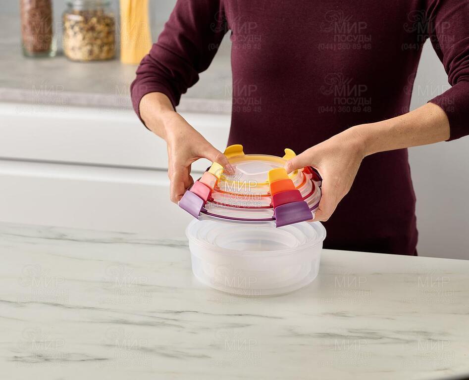 Набор контейнеров Nest Lock от английского производителя Joseph Joseph изготовлен из полипропилена и силикона. Комплект состоит из 4 контейнеров, которые легко складываются друг в друга и оснащены плотно защелкивающимися крышками с цветовой маркировкой для быстрого и удобного поиска. Продуманный дизайн позволяет хранить контейнеры, занимая минимум места на полке. Все составляющие набора подходят для хранения продуктов в холодильнике и для разогрева продуктов в микроволновой печи.