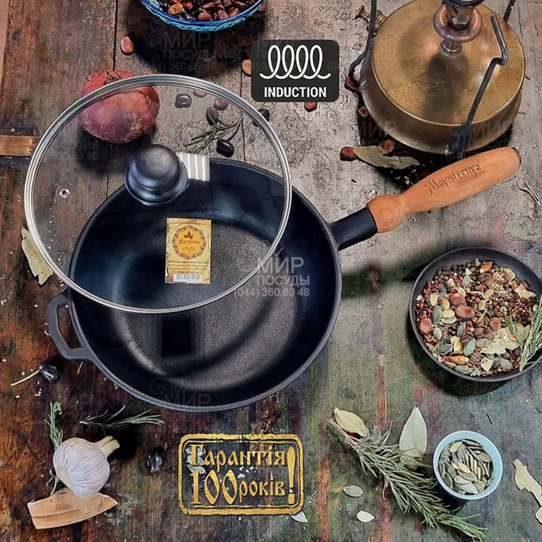 Сковорода от украинского бренда Maysternya изготовлена из чугуна. Покрытие на чугунной посуде образуется в процессе прокаливания, а в процессе приготовления оно постоянно обновляется. Но это не антипригарное покрытие, а тончайшая полимерная пленка из запеченного масла, которая защищает сковороду от коррозии, а также обладает гидрофобными свойствами (отталкивает воду). И потому, чтобы не прилипало, готовить нужно с растительным маслом. Чугун обладает хорошей теплопроводностью, что позволяет равномерно прогревать всю поверхность сковороды и равномерно жарить.