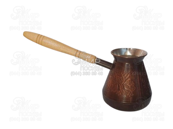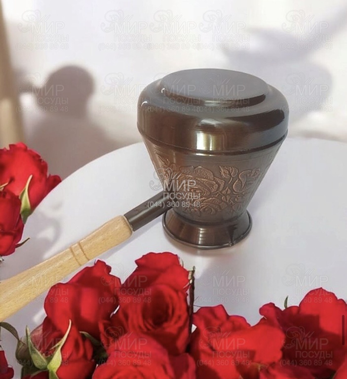 Турка украинского производства изготовлена из меди М1, идеально сочетает в себе прочность и стиль. Пищевое олово внутри защищает от контакта с медью и оставляет чистый вкус, а наружное покрытие из черного никеля придает современной элегантности. Дубовая ручка, надежно припаянная через медную трубку, делает процесс приготовления кофе удобным и безопасным.