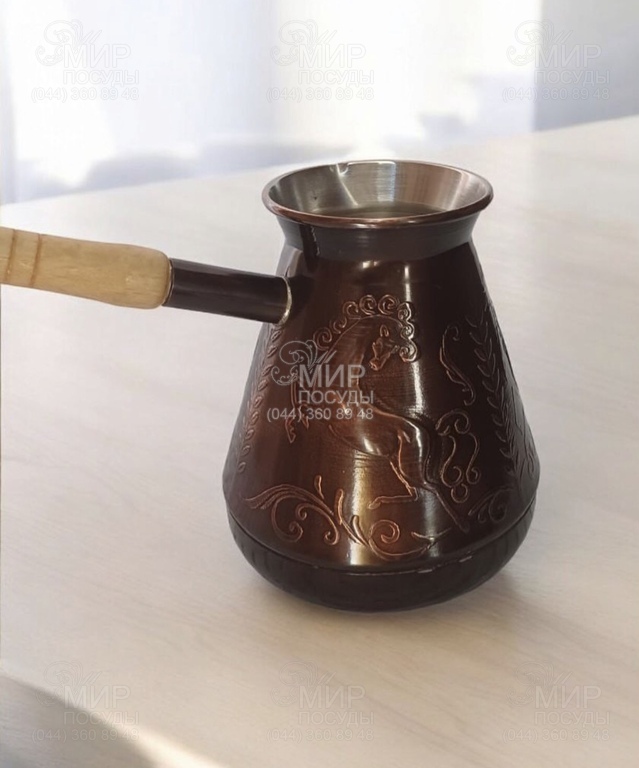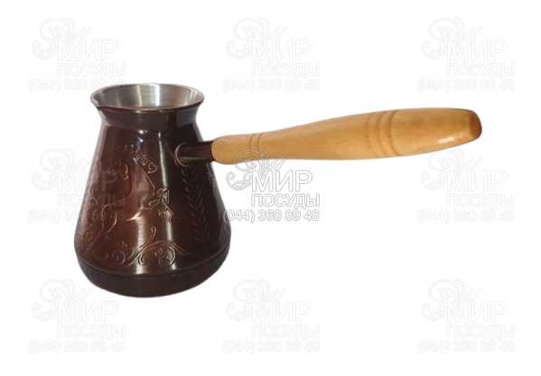 Турка украинского производства изготовлена из меди М1, идеально сочетает в себе прочность и стиль. Пищевое олово внутри защищает от контакта с медью и оставляет чистый вкус, а наружное покрытие из черного никеля придает современной элегантности. Дубовая ручка, надежно припаянная через медную трубку, делает процесс приготовления кофе удобным и безопасным.