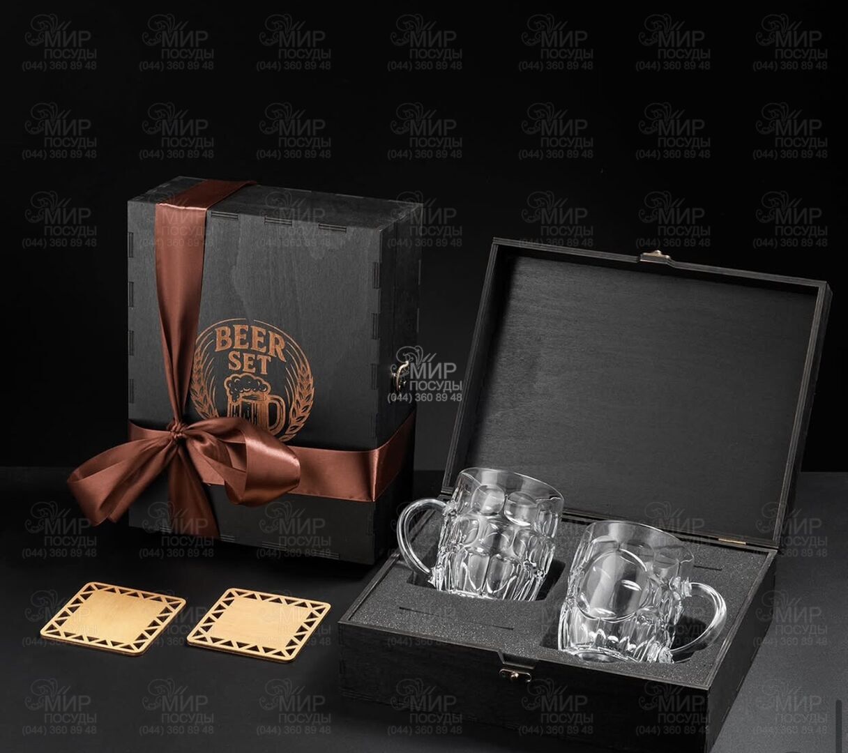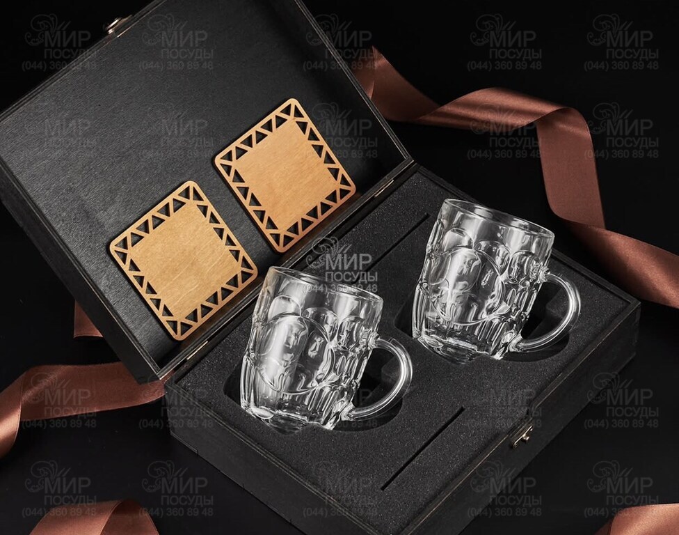 Подарочный набор для пива Britannia Luminarc – стильное решение для настоящих ценителей хмельного напитка. В комплект входит 2 вместительные стеклянные кружки классической формы, 2 деревянные подставки под кружки и элегантная подарочная коробка с декоративной лентой. Такой набор станет оригинальным презентом для мужчины, коллеги или друга на любой праздник. Качественная деревянная подарочная коробка в темном дереве. Внутренняя часть – это мягкий бархатный ложемент, на котором размещены 2 кружки и 2 костера.