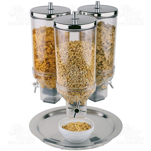 Диспенсер для мюслей тройной от немецкого производителя APS предназначен для дозировки сыпучих продуктов. Основание изготовлено из нержавеющей стали, а емкость для мюсли - из пластика. Имеет эластический дозатор. Герметическая крышка поддерживает свежесть содержимого. Может устанавливаться на столе или крепиться к стене. Можно использовать для шведских столов и линий раздачи.