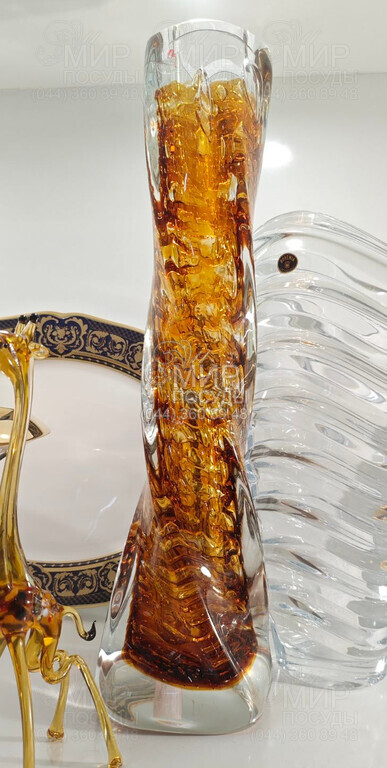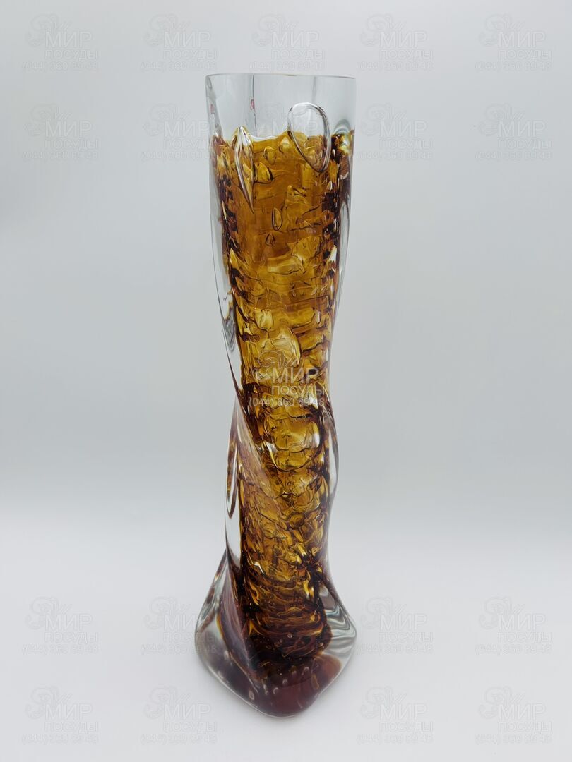 Ваза от чешского производителя изготовлена из стекла. Помимо изящно закрученой формы, ваза обладает великолепным янтарным цветом, что превращает изделие в элегантное украшение интерьера. Толстые стенки вазы делают ее массивной, что придает интерьеру пышности и нарядности.