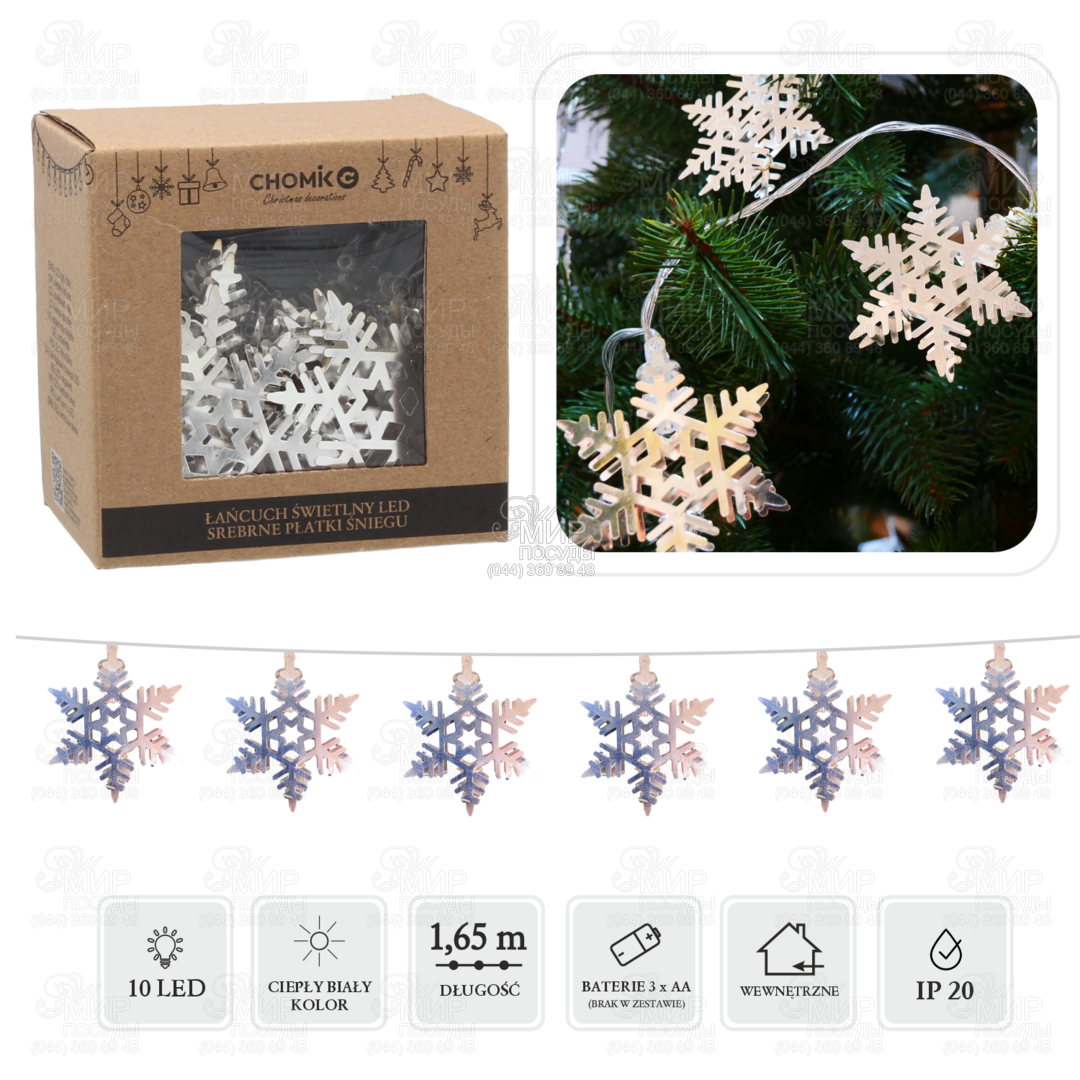 Новогодняя гирлянда – это не только классическое елочное украшение, а и волшебная игра ярких LED огоньков, которые подарят Вам праздничное настроение, тепло, уют, приятные эмоции, наполнив интерьер светом и атмосферой сказочного Нового года. Гирлянда от польского бренда Chomik с теплым белым цветом свечения станет интересным акцентом на Вашем новогоднем дереве или в качестве дополнительного элемента декорирования интерьера. Отличается мягким статическим светом, надежностью и долговечностью. Объемные снежинки придают изделию особую сказочность и торжественность. Поскольку источником питания являются батарейки, гирлянда легко найдет свое место в пределах Ваших креативных решений по созданию уютной рождественской атмосферы.