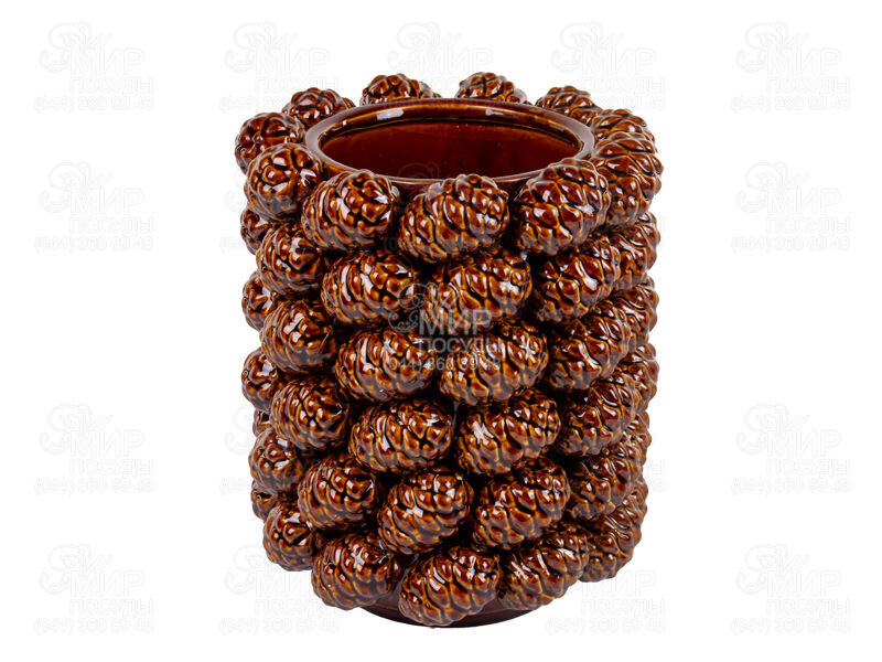 Ваза с рельефными сосновыми шишками насыщенного коричневого цвета придаст природной свежести и уюта интерьеру. Глянцевая поверхность отражает свет, а необычная форма делает ее отличным элементом декора. Она идеально подойдет как для живых, так и для искусственных цветов или станет самостоятельным арт-объектом, что подчеркнет индивидуальность интерьера.