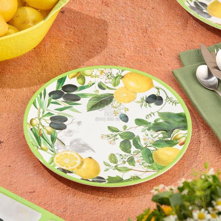 Тарелки Лимоны и Оливки от американского бренда Certified International изготовлены из меламина. Набор представляет собой легкую, но прочную альтернативу керамике, идеально подходящую для еды как в помещении, так и на открытом воздухе. Комплект на 4 персоны украшен яркими мотивами лимонов и оливковых ветвей, а яркий цитрусовый узор добавит освежающего цветового акцента. Организуете ли Вы барбекю, уютную вечеринку или семейный завтрак, этот стильный набор привнесет тепло Средиземноморья к Вашему столу.