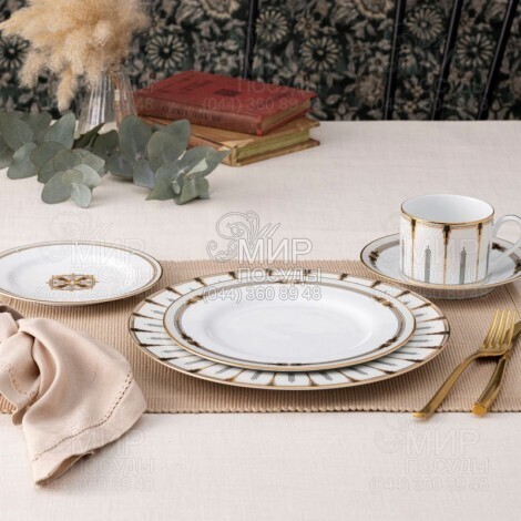 Коллекция Empire Gold от Noritake — это дизайн в стиле ар-деко, сочетающий в себе линейные геометрические элементы. Вдохновленный такими мотивами, как перья и украшения на женских головных уборах, серия воплощает в себе красоту ар-деко, подчёркивающую вертикальную симметрию. Возрождается популярность винтажных украшений, а сильный контраст чёрного, золотого и жемчужно-серого создаёт динамичную, роскошную цветовую гамму. С коллекцией Empire Gold Вы можете создать современную и гламурную обстановку стола, напоминающую сцену из классического фильма.