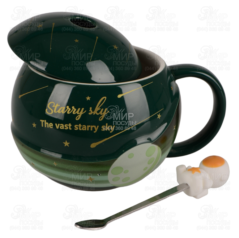 Керамическая кружка с крышкой и ложкой Starry Sky – это стильный и волшебный аксессуар, который сразу создает атмосферу тепла и мечтательности. Глубокий изумрудный цвет, золотистые звезды и кометные линии напоминают о бескрайнем космосе, а надпись Starry sky — The vast starry sky придает особое настроение и вдохновение. Благодаря оригинальному дизайну кружка станет не только функциональной посудой, но и украшением рабочего стола. Модель оснащена удобной крышкой с отверстием для ложки, что помогает сохранить тепло дольше. В комплекте идет металлическая ложечка с декоративной фигуркой в виде маленького космонавта — милый акцент, делающий кружку идеальным вариантом для подарка. Такая кружка — это маленькое путешествие в звездную вселенную, которое будет сопровождать тебя с каждым глотком любимого напитка.