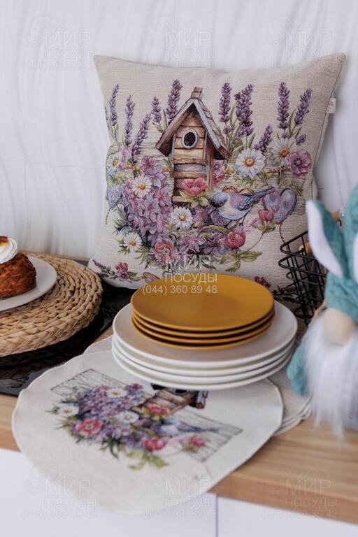 Коллекция гобеленового текстиля Лавандовый садик украинского бренда Прованс — это сочетание утонченного дизайна, качественных материалов и особой атмосферы уюта. Вдохновленная нежной флористикой и волшебными иллюстрациями, коллекция создает теплое, светлое настроение в доме и наполняет простор эстетикой спокойствия и гармонии. Гобеленовые изделия отличаются плотным переплетением нитей, благодаря чему рисунок выглядит объемным, глубоким и детализированным. Пастельная палитра, аккуратные орнаменты и продуманное оформление делают текстиль универсальным для кухни, столовой или гостиной. Коллекция отлично подходит как для ежедневного использования, так и для праздничной сервировки стола. В серии представлены скатерти, декоративные наволочки, салфетки, дорожки на стол и другие текстильные элементы, легко комбинирующиеся между собой, создавая цельный ансамбль.