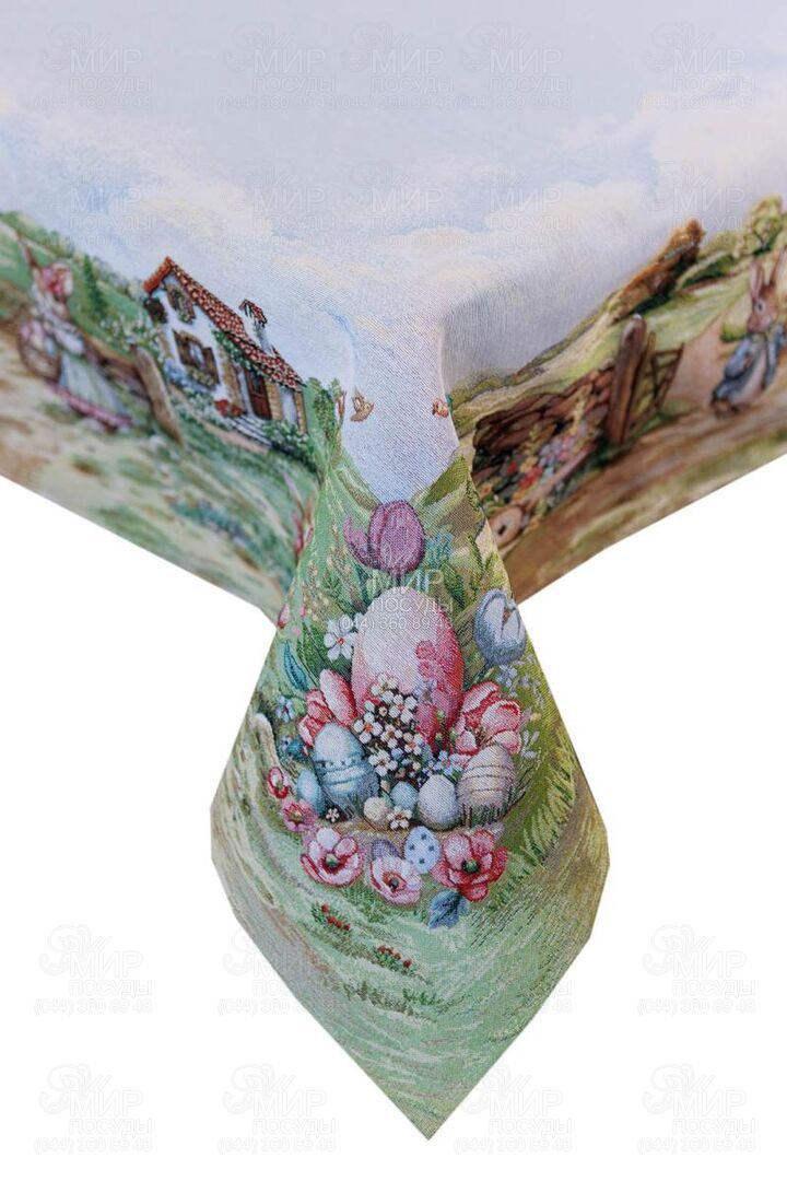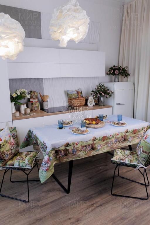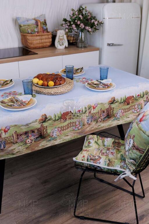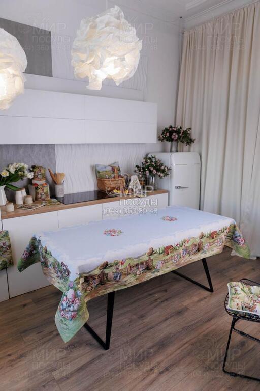 Пасхальная коллекция гобелена Настроение от украинского бренда Прованс — это настоящая весенняя история, сотканная в ткани. Дизайн наполнен атмосферой уютного деревенского пейзажа: зеленые лужайки, декоративные ограждения, цветущие сады, праздничные корзины с писанками и милый пасхальный кролик создают ощущение теплой семейной традиции и светлого праздника. Панорамный сюжет расположен вдоль края изделий, что придает скатерти особую выразительность и делает ее центральным акцентом сервировки. Нежное голубое основание гармонично сочетается с пастельными оттенками зеленого, розового и кремового, создавая легкое, свежее весеннее настроение. Гобеленовое переплетение обеспечивает объемность рисунка и глубину цвета – изображение не нанесено поверхностно, а выткано в структуре ткани. Благодаря этому изделия отличаются плотностью, долговечностью и стойкостью к износу. Коллекция идеально подходит для праздничного стола на Пасху и создания сезонного декора в доме. В серии представлены скатерти, декоративные наволочки и текстильные аксессуары, легко комбинирующиеся между собой, формируя завершенную композицию.