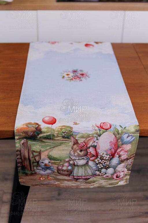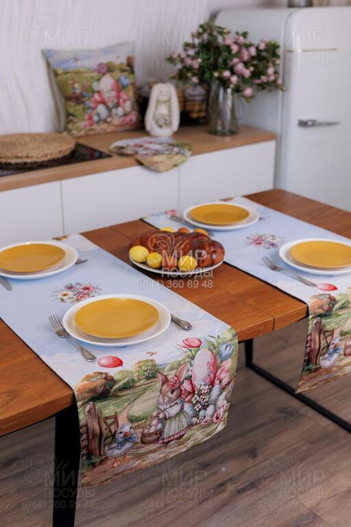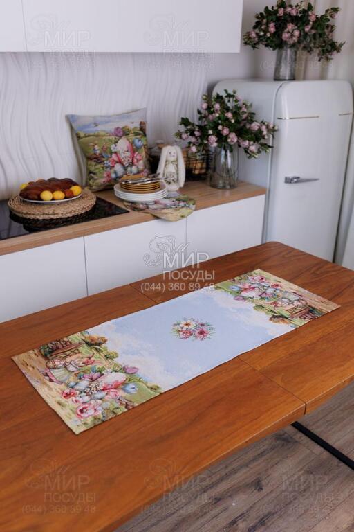 Пасхальная коллекция гобелена Настроение от украинского бренда Прованс — это настоящая весенняя история, сотканная в ткани. Дизайн наполнен атмосферой уютного деревенского пейзажа: зеленые лужайки, декоративные ограждения, цветущие сады, праздничные корзины с писанками и милый пасхальный кролик создают ощущение теплой семейной традиции и светлого праздника. Панорамный сюжет расположен вдоль края изделий, что придает скатерти особую выразительность и делает ее центральным акцентом сервировки. Нежное голубое основание гармонично сочетается с пастельными оттенками зеленого, розового и кремового, создавая легкое, свежее весеннее настроение. Гобеленовое переплетение обеспечивает объемность рисунка и глубину цвета – изображение не нанесено поверхностно, а выткано в структуре ткани. Благодаря этому изделия отличаются плотностью, долговечностью и стойкостью к износу. Коллекция идеально подходит для праздничного стола на Пасху и создания сезонного декора в доме. В серии представлены скатерти, декоративные наволочки и текстильные аксессуары, легко комбинирующиеся между собой, формируя завершенную композицию.