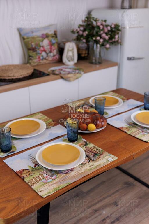 Пасхальная коллекция гобелена Настроение от украинского бренда Прованс — это настоящая весенняя история, сотканная в ткани. Дизайн наполнен атмосферой уютного деревенского пейзажа: зеленые лужайки, декоративные ограждения, цветущие сады, праздничные корзины с писанками и милый пасхальный кролик создают ощущение теплой семейной традиции и светлого праздника. Панорамный сюжет расположен вдоль края изделий, что придает скатерти особую выразительность и делает ее центральным акцентом сервировки. Нежное голубое основание гармонично сочетается с пастельными оттенками зеленого, розового и кремового, создавая легкое, свежее весеннее настроение. Гобеленовое переплетение обеспечивает объемность рисунка и глубину цвета – изображение не нанесено поверхностно, а выткано в структуре ткани. Благодаря этому изделия отличаются плотностью, долговечностью и стойкостью к износу. Коллекция идеально подходит для праздничного стола на Пасху и создания сезонного декора в доме. В серии представлены скатерти, декоративные наволочки и текстильные аксессуары, легко комбинирующиеся между собой, формируя завершенную композицию.