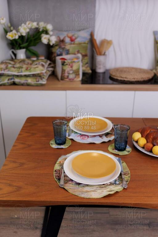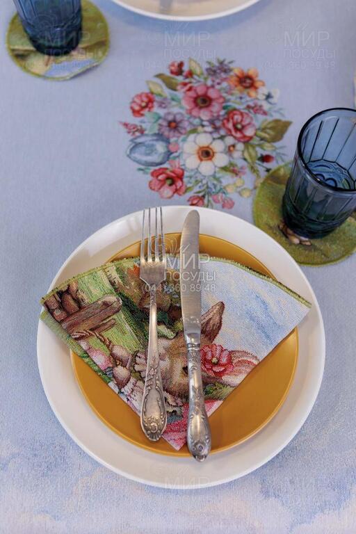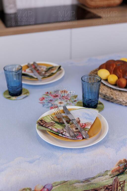 Пасхальная коллекция гобелена Настроение от украинского бренда Прованс — это настоящая весенняя история, сотканная в ткани. Дизайн наполнен атмосферой уютного деревенского пейзажа: зеленые лужайки, декоративные ограждения, цветущие сады, праздничные корзины с писанками и милый пасхальный кролик создают ощущение теплой семейной традиции и светлого праздника. Панорамный сюжет расположен вдоль края изделий, что придает скатерти особую выразительность и делает ее центральным акцентом сервировки. Нежное голубое основание гармонично сочетается с пастельными оттенками зеленого, розового и кремового, создавая легкое, свежее весеннее настроение. Гобеленовое переплетение обеспечивает объемность рисунка и глубину цвета – изображение не нанесено поверхностно, а выткано в структуре ткани. Благодаря этому изделия отличаются плотностью, долговечностью и стойкостью к износу. Коллекция идеально подходит для праздничного стола на Пасху и создания сезонного декора в доме. В серии представлены скатерти, декоративные наволочки и текстильные аксессуары, легко комбинирующиеся между собой, формируя завершенную композицию.